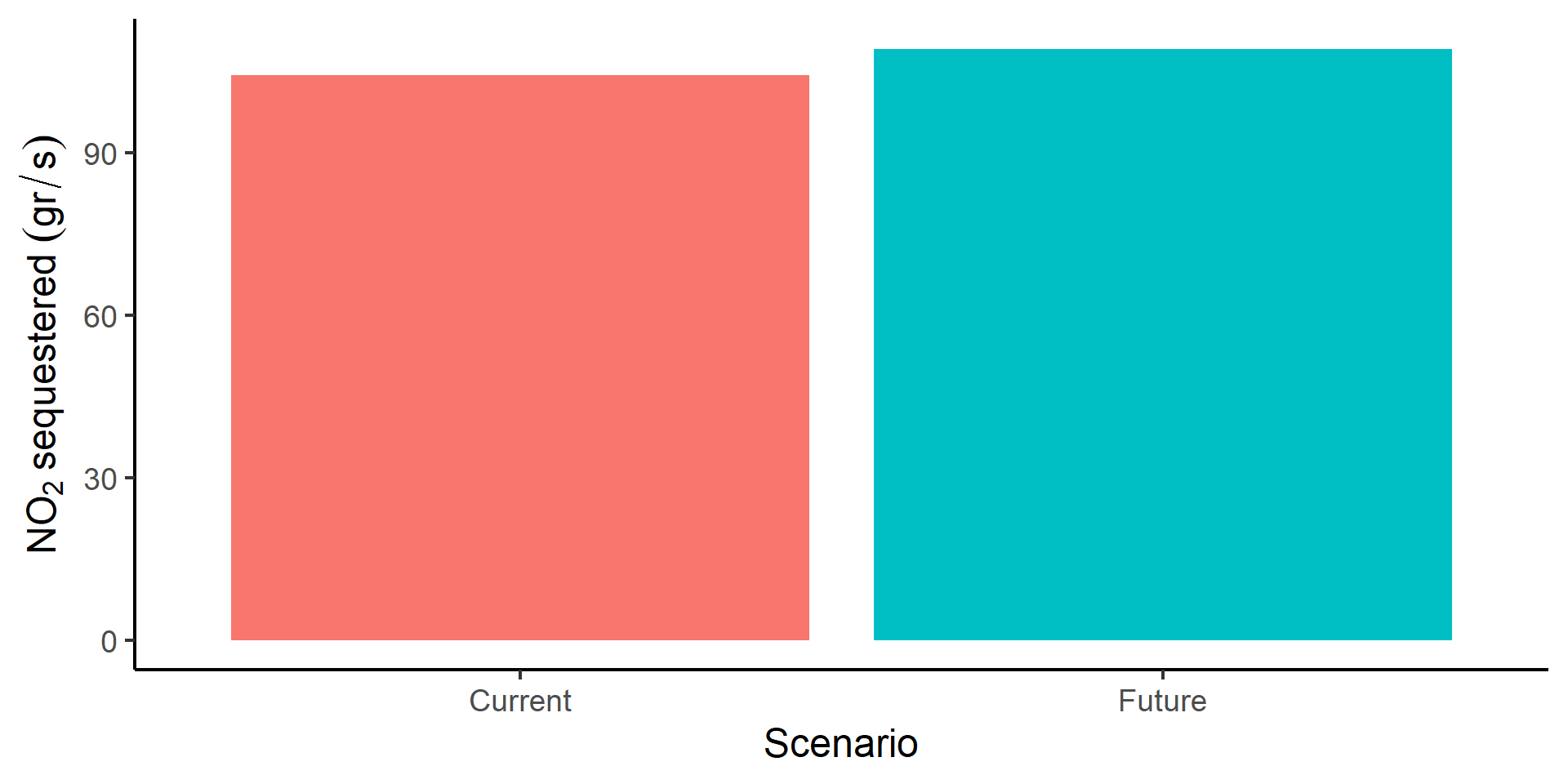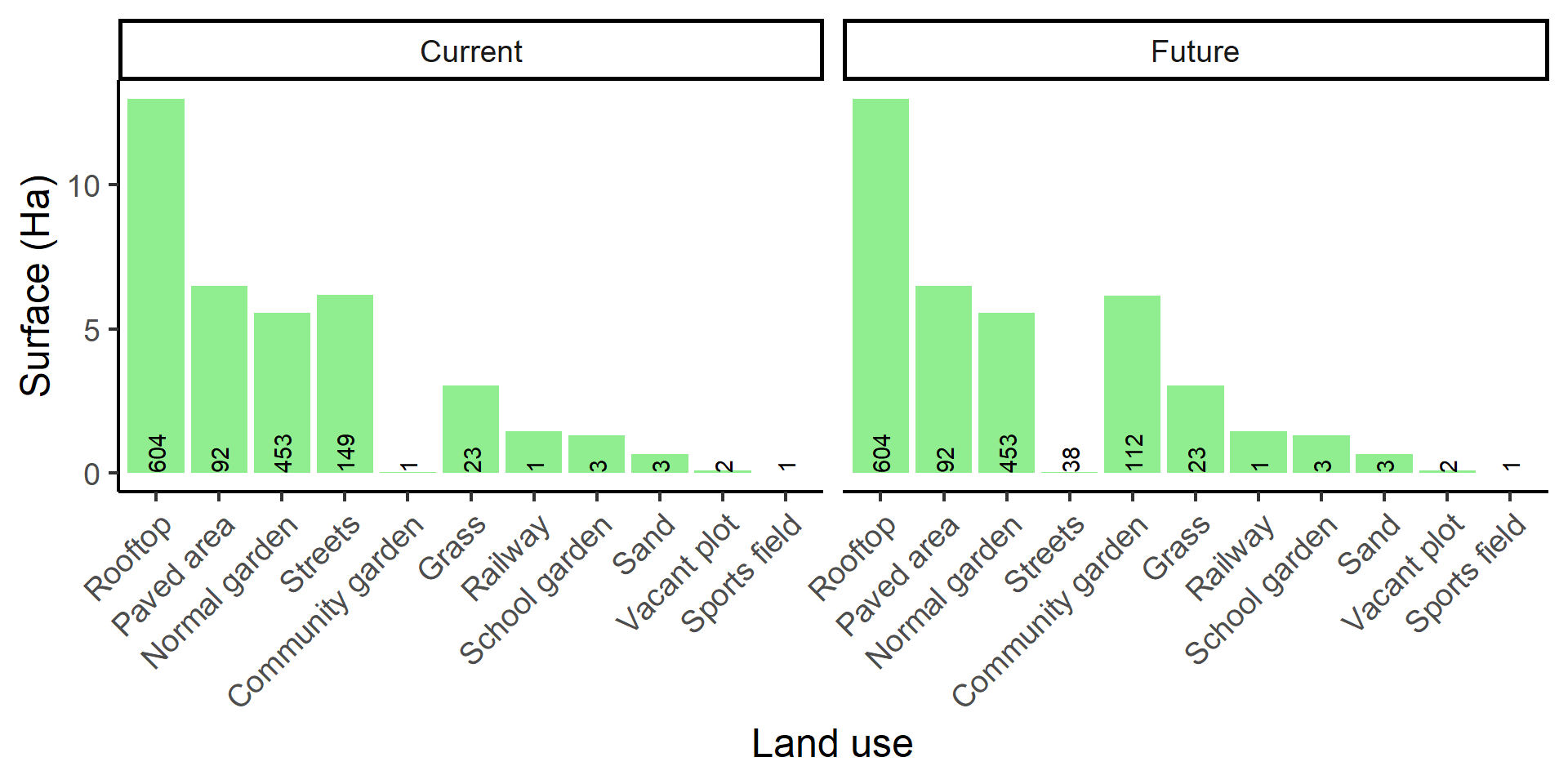 Given a rain event of 85 l/day, the difference in runoff prevention between current and future scenario is 1.36 mm.